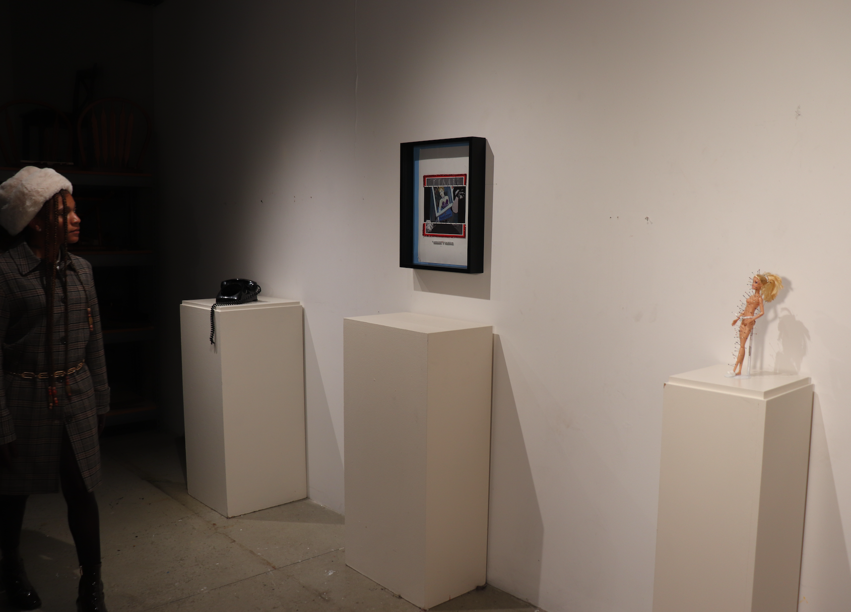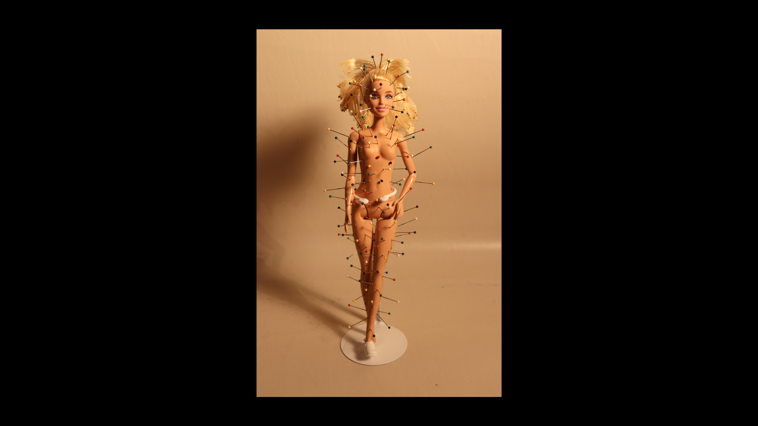 Medium: Mixed-Media Sculpture, plastic, enamel pins, metal stand